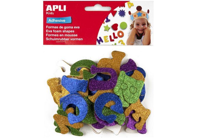 Pěnová guma Eva sheets písmena se třpytkami samolepící různé barvy APLI