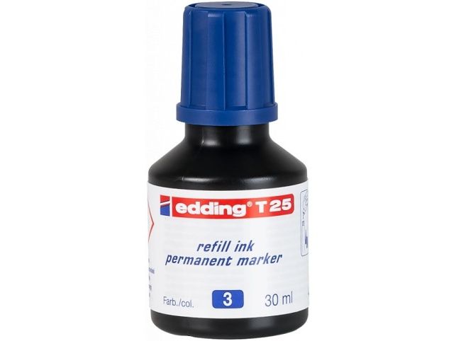 Permanentní inkoust EDDING T25, modrý. Vhodný téměř do všech permanentních popisovačů EDDING. Lahvička obsahuje 30 ml inkoustu. Šetří náklady na nové popisovače a doplňováním inkoustu se snižuje množství produkovaného odpadu.