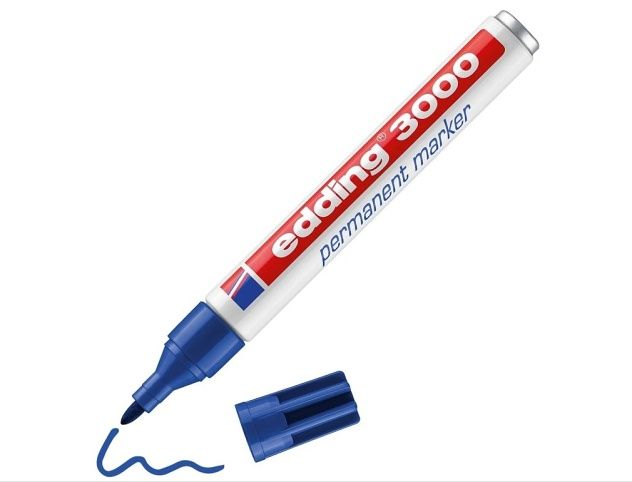 Permanentní popisovac Edding 3000, odolný proti rozmazání a opotrebení, funguje témer na všechny povrchy. Hodí se do každé domácnosti pro oznacování témer všech materiálu, napr. karton, plast, sklo, kov, drevo, kuže. Je rychleschnoucí, s nízkým zápachem. Odolný proti vode, teplu a opotrebení. Doplnitelný. Vhodné jsou k tomu náplne: Edding T 25, Edding T 100 a Edding T 1000 a Edding MTK 25. K dispozici jsou náhradní hroty (Edding 3000N). Inkoust bez pridaného toluenu / xylenu. Hrot má šírku stopy 1,5-3 mm.
