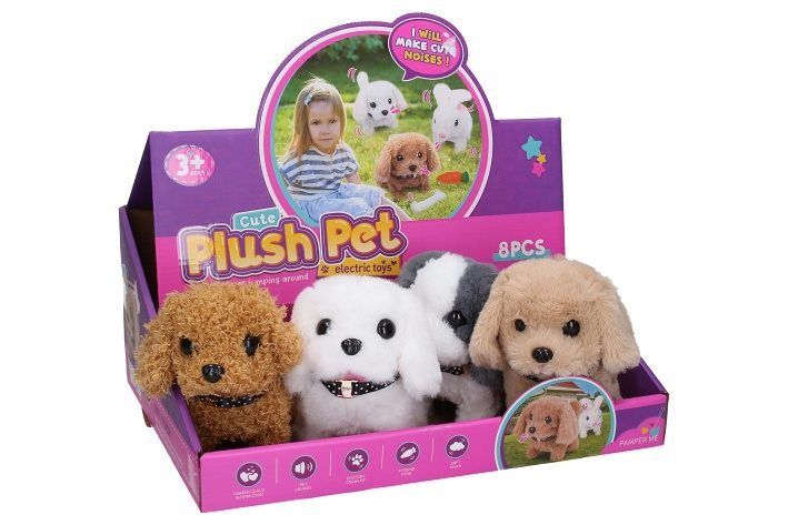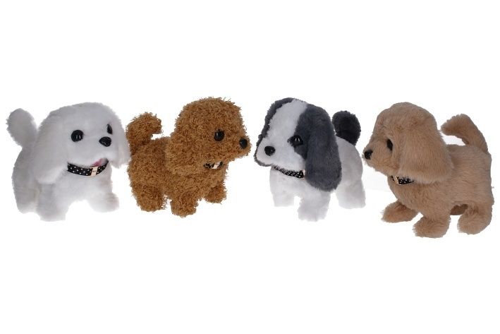 Pes chodící se zvukovými efekty. Rozměry 16x9x12 cm. Display box - 8 ks. Chodí, hýbá ocasem a mňouká. ON/OFF přepínač na spodní straně. 2xAA baterie nejsou součástí.