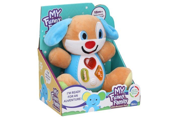 Pes interaktivní pro nejmenší s efekty. Rozměry 22,5x11,5x18,2 cm. ON/OFF přepínač na straně psa. Plyšový s plastovým bříškem. Aktivace tlačítky na bříšku - světelné efekty, zvukové efekty a melodie. Baterie 2xAAA, nejsou součástí.