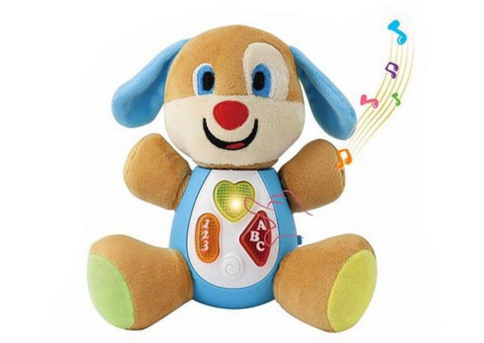 Pes interaktivní pro nejmenší s efekty. Rozměry 22,5x11,5x18,2 cm. ON/OFF přepínač na straně psa. Plyšový s plastovým bříškem. Aktivace tlačítky na bříšku - světelné efekty, zvukové efekty a melodie. Baterie 2xAAA, nejsou součástí.