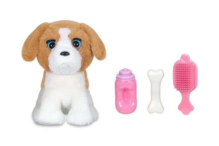 Pes interaktivní set. Velikost 24 cm. Zvukové efekty a mrkání stlačením pravé packy a přiložením předmětů nebo dotykem (stiskem) jiné části těla - hlavy, čumáku, hrudi, hřbetu (štěkání, kýchání a další). 3x rychlý dotek hlavy - zavře oči a spí. Přiložení láhve a kostičky k tlamičce - papání. 3xAA baterie součástí. Přepínač on/off/try me v zadní části hlavy. Součástí hřeben na česání.