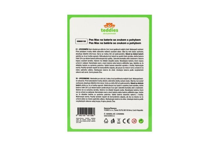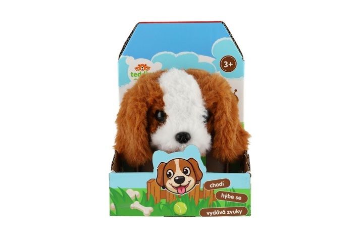 Roztomilý pejsek chodí dopředu i dozadu a vydává reálné zvuky štěkání. Pejsek je balen v krabičce, která je zároveň jeho boudou. Baterie 2x AA nejsou součástí výrobku.