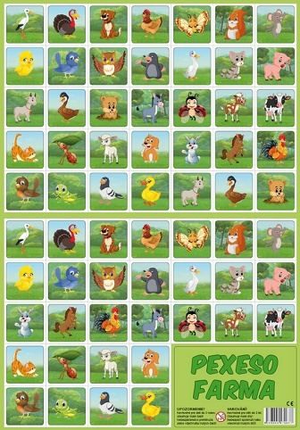 Společenská hra, při které si děti hravou formou trénují svou paměť. Hra se po rozstříhání skládá z 32 obrázkových dvojic. Pexeso 32 dvojic s obrázky kreslených zvířátek z domácí farmy.