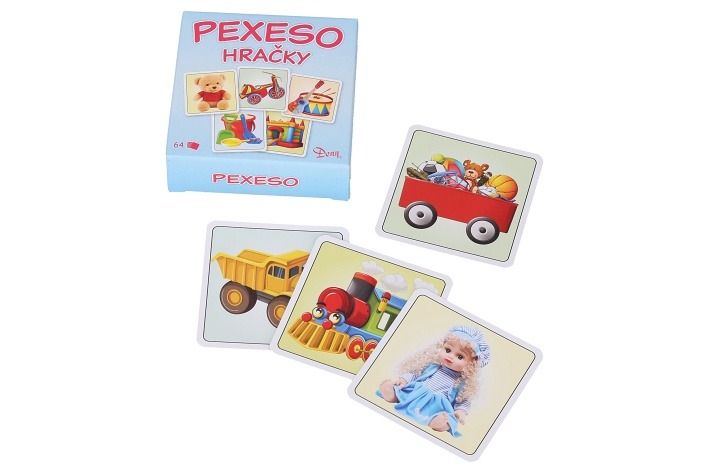 Pexeso Hračky v krabičce. Balení obsahuje 64 karet (32 párů) + 2 karty s pravidly. Rozměr krabičky 8x8x2,5 cm.