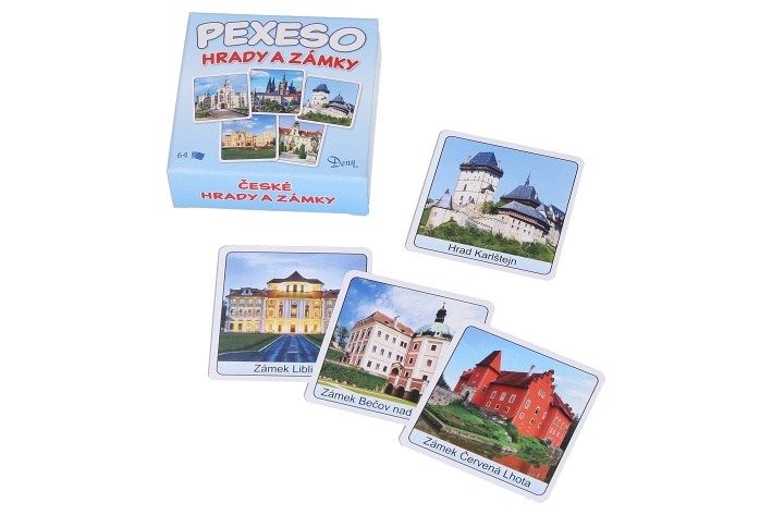 Pexeso Hrady a zámky ČR v krabičce. Balení obsahuje 64 karet (32 párů) + 2 karty s pravidly. Rozměr krabičky 8x8x2,5 cm.