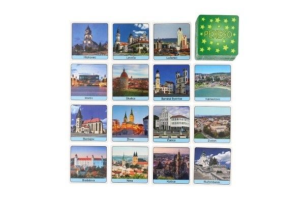 Pexeso Mestá SR papírové společenská hra 32 obrázkových dvojic v papírové krabičce 8x8cm