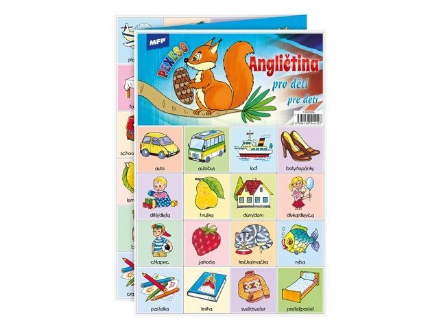 PEXESO je populární dětská stolní hra, která nikdy neomrzí a zapojit se můžou i dospělí. Pexeso - Angličtina pro děti - je vhodné pro děti, které se chtějí naučit anglicky. Věděli jste, že slovo PEXESO vzniklo souslovím slov PEKELNĚ SE SOUSTŘEĎ? Výborná učební pomůcka pro děti a rodiče. Naučte své děti poznávat nová slovíčka a procvičujte jejich paměť. Tato hra je zabaví na dlouhé hodiny. Pexeso se skládá ze tří A4, na kterých najdete 64 kartiček základních slovíček a návod ke hře - české i anglické názvy se správnou výslovností. NÁVOD KE HŘE PEXESO: Pexeso mohou hrát nejméně dva hráči. Všechny rozstříhané kartičky zamíchají a rozloží obrázkem dolů do čtverce 8 x 8 kartiček. Nesmí se při tom dívat na obrázek. Hráči si určí pořadí hry. Hráč otočí dvě libovolné kartičky tak, aby si i ostatní spoluhráči mohli obrázky a jejich umístění zapamatovat. Pokud nemají kartičky stejné obrázky, otočí je a vrátí na původní místo. Pokračuje další hráč, který je na řadě. Jestliže objeví stejné obrázky, získává bod a obě kartičky vyřadí ze hry. Pokračuje do té chvíle, kdy otočí dva různé obrázky. Vyhrává hráč, který získá více bodů. PAPÍR: křída matná 350g + lamino lesk 1/1 VELIKOST HRACÍCH KARET: 51x51cm VAROVÁNÍ: Nevhodné pro děti do 3 let. Nebezpečí vdechnutí a spolknutí malých částic. Uvedená cena je za 1 ks.