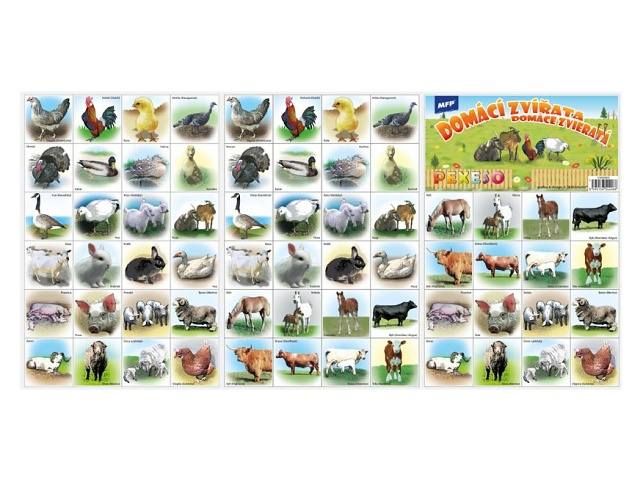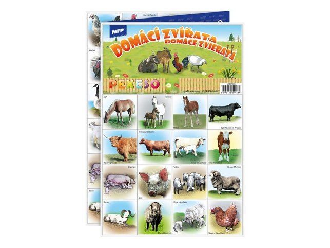 PEXESO je populární dětská stolní hra, která nikdy neomrzí a zapojit se můžou i dospělí. Pexeso - domácí zvířata - nás zavede do prostředí domácích zvířátek. Věděli jste, že slovo PEXESO vzniklo souslovím slov PEKELNĚ SE SOUSTŘEĎ? Výborná učební pomůcka pro děti a rodiče. Naučte své děti poznávat zvířata a procvičujte jejich paměť. Tato hra je zabaví na dlouhé hodiny.Pexeso se skládá ze tří A4, na kterých najdete 64 kartiček domácích zvířat a návod ke hře - na kartičkách jsou názvy zvířatNÁVOD KE HŘE PEXESO:Pexeso mohou hrát nejméně dva hráči. Všechny rozstříhané kartičky zamíchají a rozloží obrázkem dolů do čtverce 8 x 8 kartiček. Nesmí se při tom dívat na obrázek. Hráči si určí pořadí hry. Hráč otočí dvě libovolné kartičky tak, aby si i ostatní spoluhráči mohli obrázky a jejich umístění zapamatovat. Pokud nemají kartičky stejné obrázky, otočí je a vrátí na původní místo. Pokračuje další hráč, který je na řadě. Jestliže objeví stejné obrázky, získává bod a obě kartičky vyřadí ze hry. Pokračuje do té chvíle, kdy otočí dva různé obrázky. Vyhrává hráč, který získá více bodů.PAPÍR: křída matná 350g + lamino lesk 1/1VELIKOST HRACÍCH KARET: 51x51cmVAROVÁNÍ:Nevhodné pro děti do 3 let. Nebezpečí vdechnutí a spolknutí malých částic.Uvedená cena je za 1 ks.