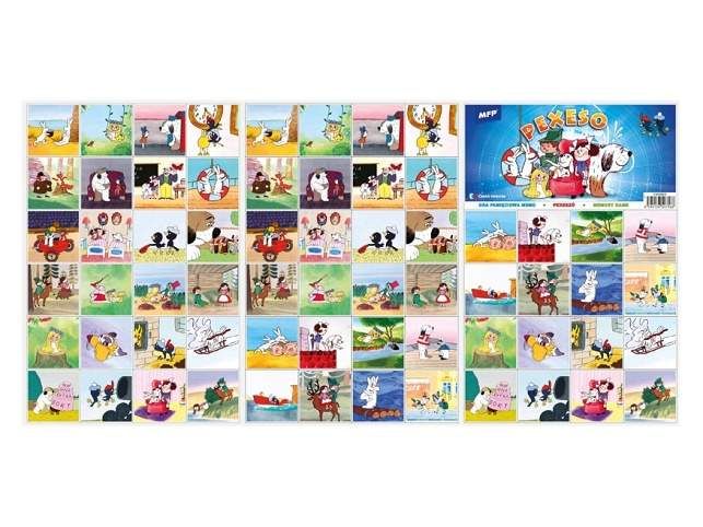 PEXESO je populární dětská stolní hra, která nikdy neomrzí a zapojit se můžou i dospělí. Pexeso - Večerníčky z ČT nás zavede zpět do pohádkového světa ČT. Bob a Bobek, Víla Amálka, Maxipes Fík a mnoho dalších naleznete v tomto pexesu. Věděli jste, že slovo PEXESO vzniklo souslovím slov PEKELNĚ SE SOUSTŘEĎ? Výborná učební pomůcka pro děti a rodiče. Naučte své děti poznávat nová slovíčka a procvičujte jejich paměť. Tato hra je zabaví na dlouhé hodiny. Pexeso se skládá ze tří A4, na kterých najdete 64 kartiček obrázků z českých pohádek a večerníčků a návod ke hře. NÁVOD KE HŘE PEXESO: Pexeso mohou hrát nejméně dva hráči. Všechny rozstříhané kartičky zamíchají a rozloží obrázkem dolů do čtverce 8 x 8 kartiček. Nesmí se při tom dívat na obrázek. Hráči si určí pořadí hry. Hráč otočí dvě libovolné kartičky tak, aby si i ostatní spoluhráči mohli obrázky a jejich umístění zapamatovat. Pokud nemají kartičky stejné obrázky, otočí je a vrátí na původní místo. Pokračuje další hráč, který je na řadě. Jestliže objeví stejné obrázky, získává bod a obě kartičky vyřadí ze hry. Pokračuje do té chvíle, kdy otočí dva různé obrázky. Vyhrává hráč, který získá více bodů. PAPÍR: křída matná 350g + lamino lesk 1/1 VELIKOST HRACÍCH KARET: 51x51cm VAROVÁNÍ: Nevhodné pro děti do 3 let. Nebezpečí vdechnutí a spolknutí malých částic. Uvedená cena je za 1 ks.