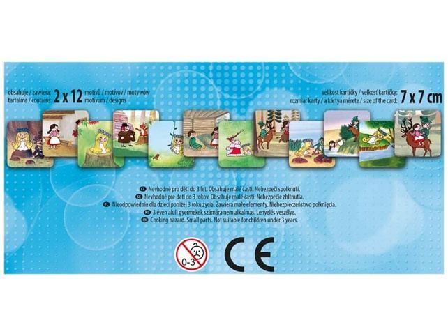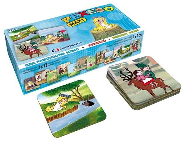 PEXESO je populární dětská stolní hra, která nikdy neomrzí a zapojit se můžou i dospělí. Pexeso - Víla Amálka + Hajný Robátko - nás zavede zpět do pohádkového světa ČT. Věděli jste, že slovo PEXESO vzniklo souslovím slov PEKELNĚ SE SOUSTŘEĎ? Výborná učební pomůcka pro děti a rodiče. Naučte své děti poznávat oblíbené české večerníčky a procvičujte jejich paměť. Tato hra je zabaví na dlouhé hodiny. Pexeso se skládá z 2x12 vyseklých kartiček pexesa. Tloušťka kartonu je 3 mm, aby jej malé děti mohly lépe uchopit a otočit. VELIKOST HRACÍCH KARET: 7 x 7 cm NÁVOD KE HŘE PEXESO: Pexeso mohou hrát nejméně dva hráči. Všechny kartičky zamíchají a rozloží obrázkem dolů. Nesmí se při tom dívat na obrázek. Hráči si určí pořadí hry. Hráč otočí dvě libovolné kartičky tak, aby si i ostatní spoluhráči mohli obrázky a jejich umístění zapamatovat. Pokud nemají kartičky stejné obrázky, otočí je a vrátí na původní místo. Pokračuje další hráč, který je na řadě. Jestliže objeví stejné obrázky, získává bod a obě kartičky vyřadí ze hry. Pokračuje do té chvíle, kdy otočí dva různé obrázky. Vyhrává hráč, který získá více bodů. VAROVÁNÍ: Nevhodné pro děti do 3 let. Nebezpečí vdechnutí a spolknutí malých částic. Uvedená cena je za 1 ks.