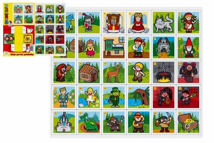 Papírové pexeso obsahuje 32 dvojic s veselými obrázky na motivy klasických pohádek. Děti si mohou sestavit i krabičku, do které si všechny kartičky mohou uklidit.