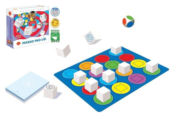 Děti hledají 2 kostky se stejným zvukem. Hra obsahuje i těžší variantu od 8 let se speciální barevnou hrací deskou. Obsahuje 16 zvukových krychliček, barevnou kostku, hrací desku, návod a poznámkový bloček.