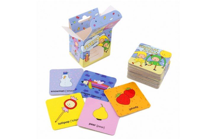 Pexeso je uložené v krabičce. Vždy jedna karta obsahuje český název a druhá do páru je v jazyce anglickém.