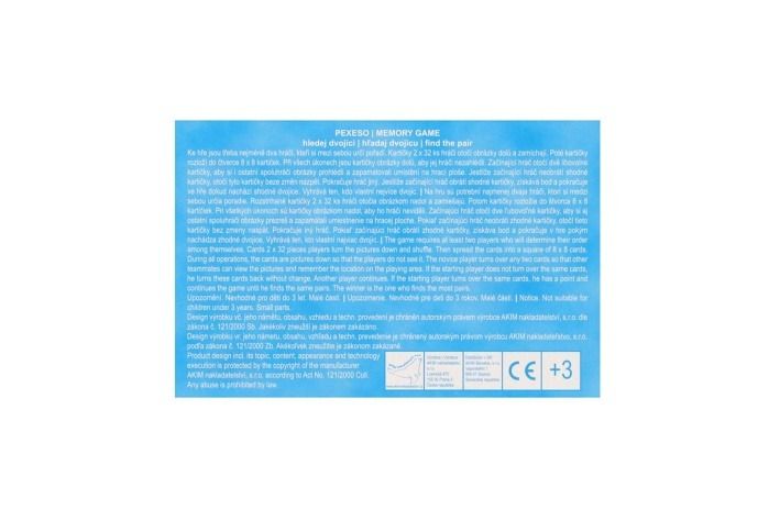 pevný karton s lesklou vodoodpudivou povrchovou úpravou, velikost kartiček 4 x 4 cm (š x d), na pexesech u titulního obrázku umístěn box k vystřižení pro možnost vložení vystřižených kartiček.