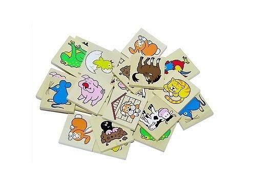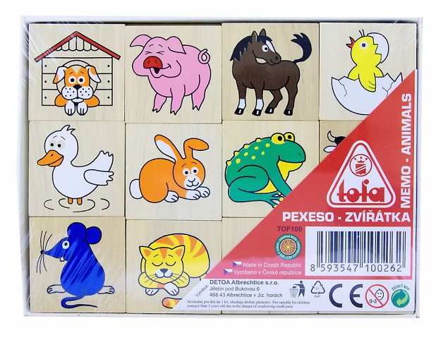 Dřevěné pexeso s obrázky zvířátek pro procvičení soustředění a paměti. Hra obsahuje 24 kusů o velikosti 40 × 40 × 5 mm. Baleno v krabičce z tvrdého papíru. Nevhodné pro děti do 3 let. Obsahuje malé části. Výrobek je zdravotně nezávadný. Rozměry výrobku 170 × 130 × 15 mm.