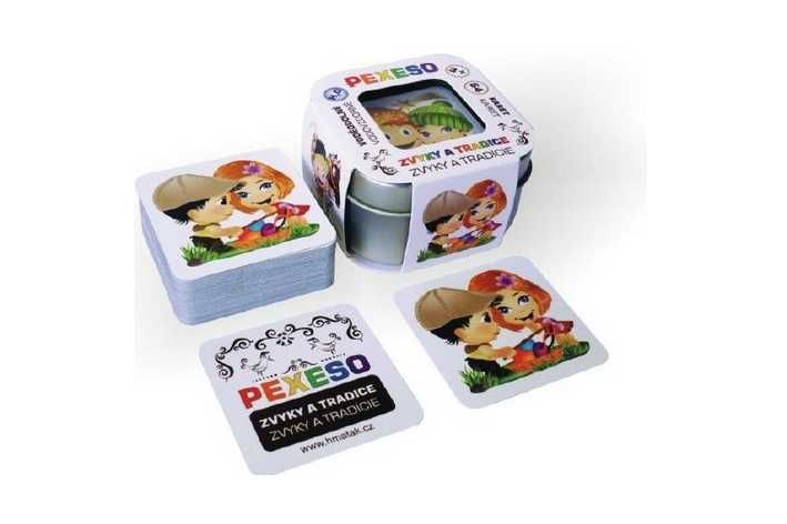 Originální pexeso v malé plechové krabičce s obrázky zvyků a tradic.
