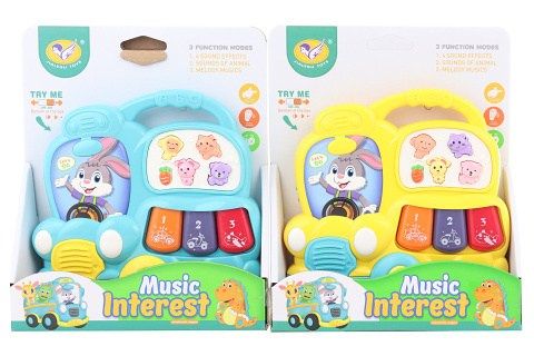 Plastové piánko ve tvaru autobusu. Hraje a vydává zvuky zvířátek. Napájení na 2 AA baterie (jsou součástí balení). Rozměry piánka cca 14,5 x 15 cm. Rozměry balení cca 16 x 19 x 5 cm. Věk 12m+