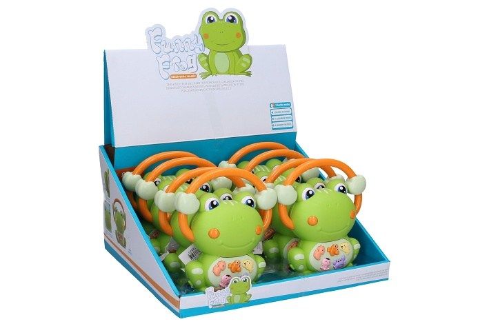 Piánko žába s efekty. Velikost 13 cm. Vydává světelné a zvukové efekty (melodie). Display box 8 ks. Baterie 3xAAA nejsou součástí.