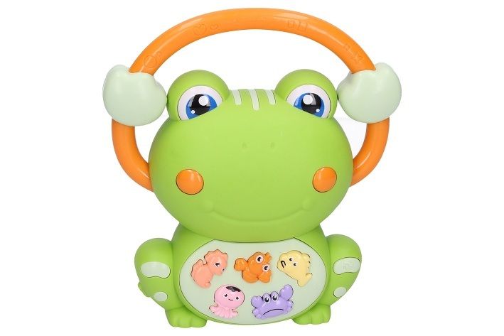 Piánko žába s efekty. Velikost 13 cm. Vydává světelné a zvukové efekty (melodie). Display box 8 ks. Baterie 3xAAA nejsou součástí.
