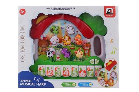 Piánko domeček se zvířátky. Materiál plast. Piánko má 8 tlačítek se zvuky zvířátek a 8 tlačítek s čísly (mluví anglicky). Napájení na 3xAA baterie, které nejsou součástí balení. Rozměry piánka 23x20x4 cm. Baleno v krabici. Rozměry balení 29x24x6 cm. Věk 3+