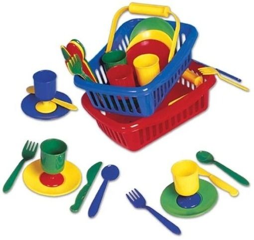 Piknik sada nádobí v košíku. Fialový košík. Rozměry košíku 23 x 16 x 8 cm. Balení obsahuje plastové nádobí a příbory.