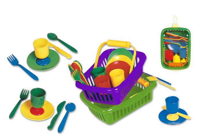 Piknik sada nádobí v košíku. Zelený košík. Rozměry košíku 23 x 16 x 8 cm. Balení obsahuje plastové nádobí a příbory.