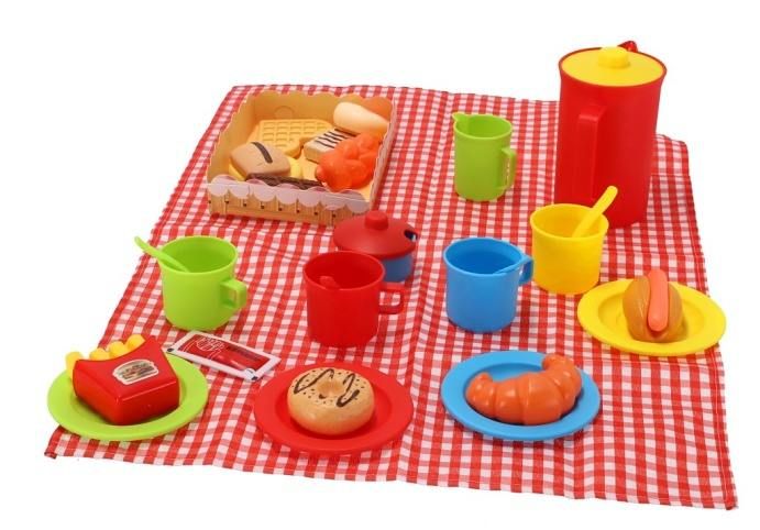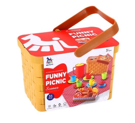 Piknicková sada z bioplastu – 35 ks. Sada obsahuje konvičku, hrnečky, makety jídla, ubrus vše v praktickém piknikovém koši.