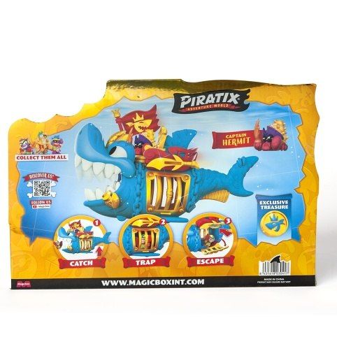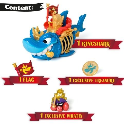 Král Žralok vládne celému oceánu – a teď je pod tvou kontrolou!Spolu s kapitánem Hermittem můžeš jedním velkým kousnutím chytit každého, kdo se ti odváží postavit. Využij sílu Krále Žraloka, získanou z náhodně spolknutého Královského pokladu Žraloka, a proplouvej hlubokými a nebezpečnými vodami ostrova. Jen s exkluzivním pokladem můžeš osvobodit nezbedné duše, které spadly do jeho čelistí. Samozřejmě jen pokud budeš chtít… Nechť tě provází duch Piratixů!Obsah balení:• 1 žralok• 1 exkluzivní pokladová mince• 1 exkluzivní iratix• 1 doplněk