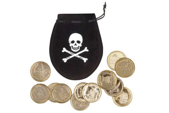 Černý látkový sáček s pirátským motivem lebky a 12 plastovými mincemi, 3 druhy mincí ve zlaté barvě o průměru 4 cm