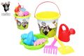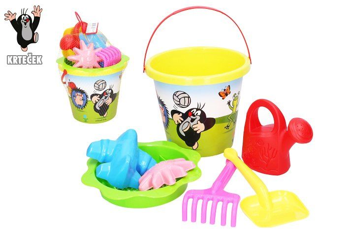 Sada na písek Krtek. Žlutá barva. Balení obsahuje kyblík 3,5 L, sítko, 2 formičky, lopatku, hrábě, konvičku.