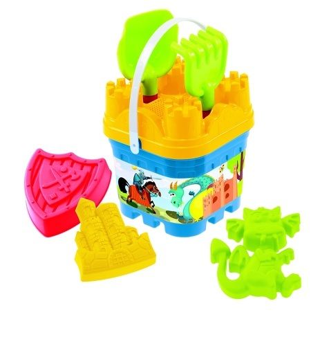 Písková sada Hrad IML. Sada obsahuje kyblík, hrabičky,lopatku, sítko, tři tématické bábovky. Vyrobeno v EU z kvalitního plastu.