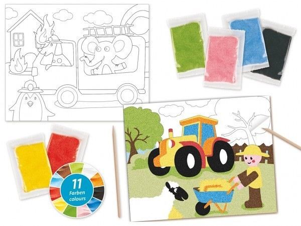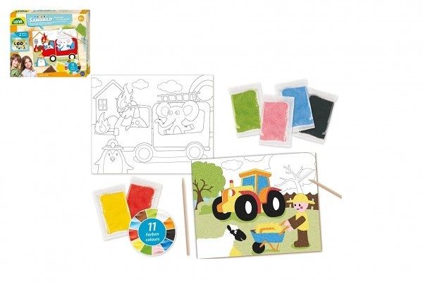 Pískové omalovánky vozidla 2 obrázky 11 barev v krabičce 20x17x5cm