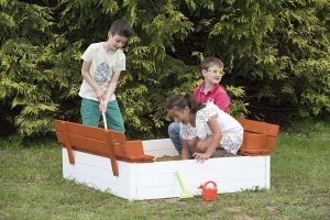 pískoviště dřevěné – borovice 120 × 120 cm 25cm vysoké jednoduchou úpravou vytvoříme z vrchního krytu 2 protilehlé dřevěné lavice na sezení !!