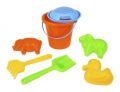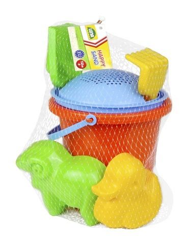7 dílná sada na písek obsahuje – kyblík o průměru 18cm / 2l, sítko, hrábě, lopatka, 3× formička – hospodářská zvířátka.