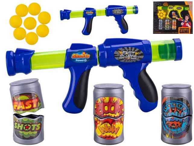 Pistole 42cm na natažení s pěnovými náboji 8ks a plechovkami 3ks 2barvy v krabičce