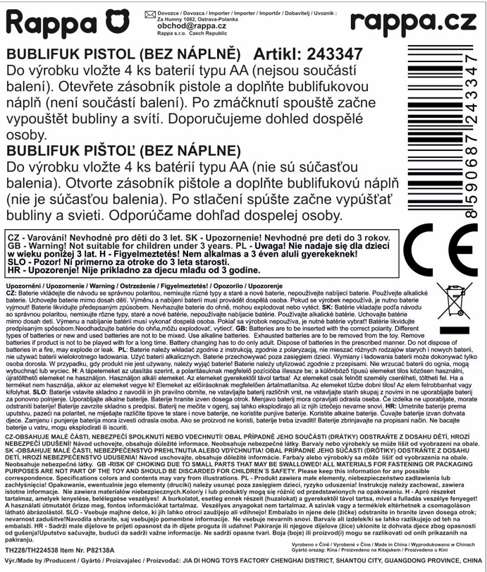 Užijte si tisíce bublinek vystřelujících z této senzační pistole. Ideální pro hru venku nebo v interiéru. Pistole funguje na 4 ks baterí typu AA, které nejsou součástí balení. Do zásobníku v pistoli nalejte náplň s bublifukem a zábava může začít! Náplň není součástí. Při zmáčknutí spouště se začnou vypuštět bubliny spolu se světelným efektem.