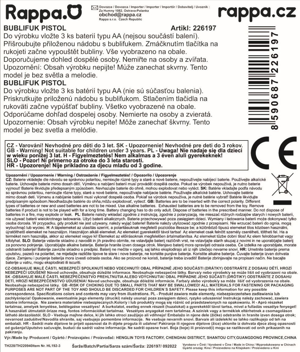 Užij si miliony bublinek vystřelujících z této senzační pistole. Ideální pro hru venku nebo v interiéru. Pistole funguje na 3 ks baterí typu AA, které nejsou součástí balení. Našroubuj zásobník s bublifukem a zábava může začít!