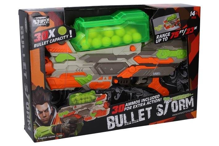 Pistole Bullet Storm s pěnovými míčky. Rozměry 35,4×25,7×8,7 cm. 30 pěnových míčků součástí. Dostřel až 23 m. Obrázkový návod s popisem na zadní straně obalu. Natahovací mechanismus v zadní části pistole. Pojistka spouště. Náhradní míčky W049343.