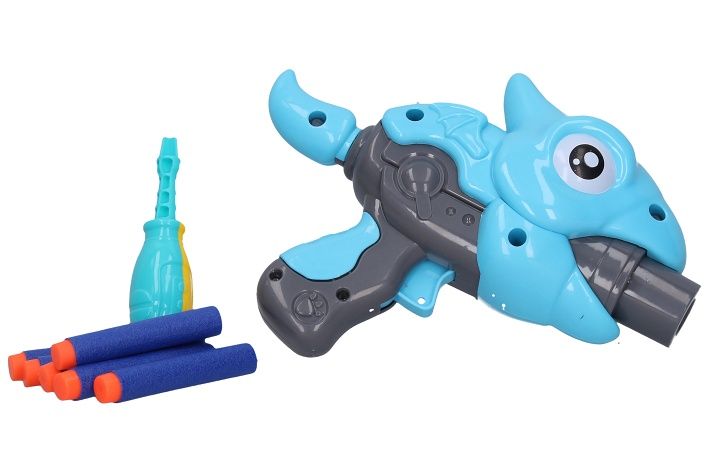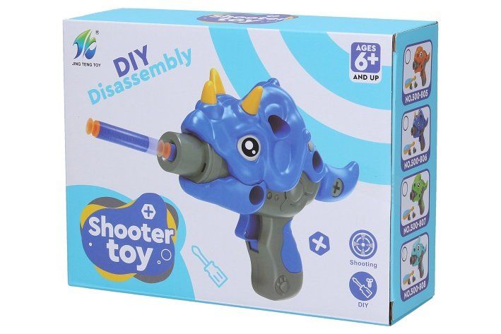Pistole na pěnové náboje. Šroubovací stavebnice s motivem dinosaurů. Velikost sestavené pistole 21 cm. Balení obsahuje dílky pistole, šroubky, šroubovák, 6 pěnových nábojů. Vystřelovací mechanismus na natažení (ocas).