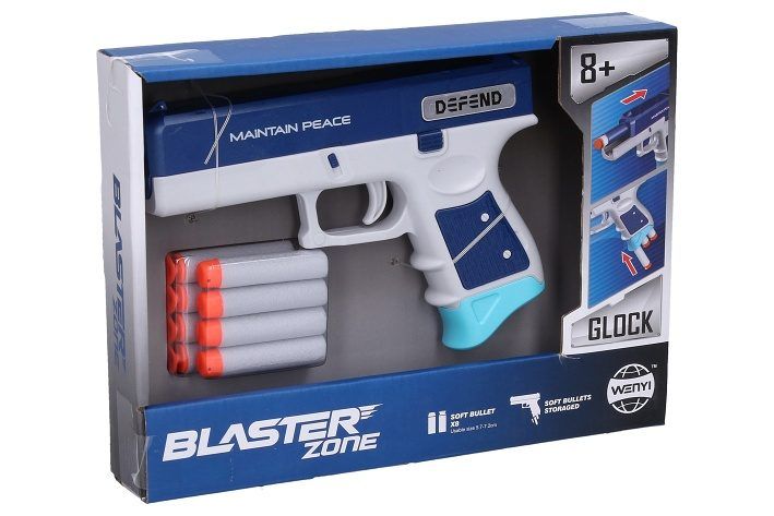 Pistole Glock s pěnovými náboji. Rozměry 19x3x13 cm. Součástí 8 pěnových nábojů (4 standardní, 4 s přísavkou). Odkládací plocha pro náboje ze spodní strany rukojeti. Obrázková návod s textem na spodní straně obalu. Střelba vložením náboje do hlavně, natažením vrchní části pistole, stisk spouště.