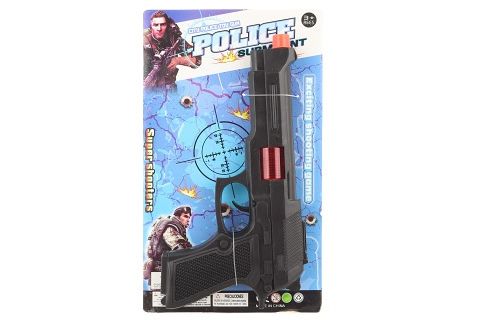 Plastová pistole. Po zmáčknutí spouště vydává zvuky. Nejsou potřeba baterie. Rozměry pistole cca 24 x 12 cm. Rozměry balení cca 15,5 x 27 x 3,5 cm. Věk 3+