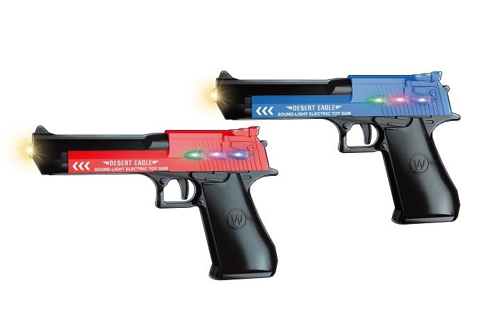 Pistole s efekty. Rozměry 22x14x3,6 cm. Světelné a zvukové efekty. 3xAA baterie nejsou součástí. 2 varianty - modrá, červená.