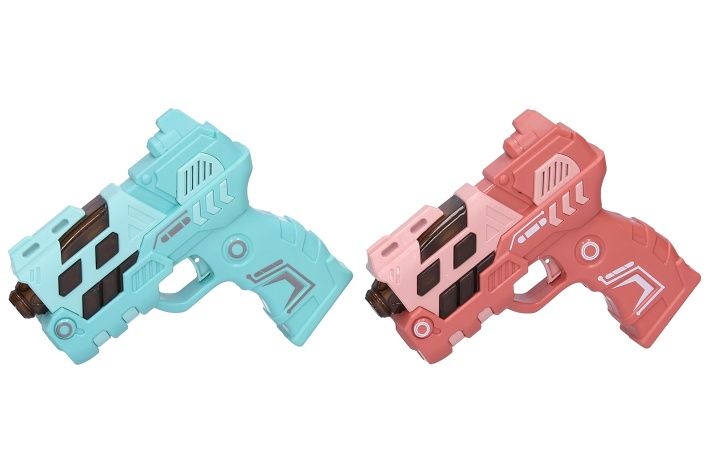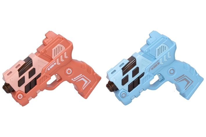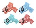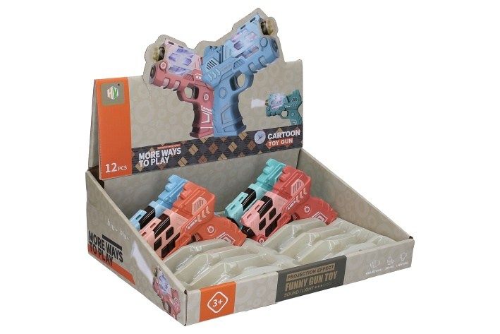Pistole s efekty. Velikost 12 cm. Světelné a zvukové efekty, projekce obrázku. 2xAAA baterie nejsou součástí. 12 ks display box. 4 varianty - modrá, zelená, oranžová, růžová.