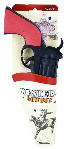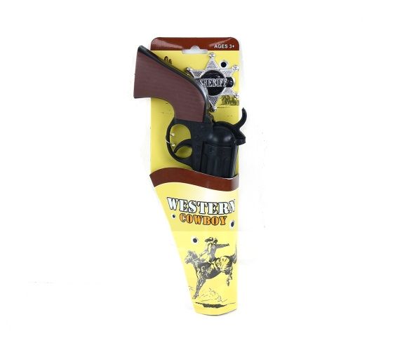 Krásná pistole pro opravdové šerify! Součástí balení je také odznak, kterým si můžeš ozdobit třeba košili. Vše je vyrobeno z PVC. Stiknutím spouště pistole vydává zvuky. Super doplňky na karneval nebo jen tak na hraní!