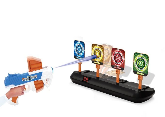 Pistole s pěnovými náboji a digitálním terčem s displejem. Velikost pistole 21 cm, rozměry terče 33x11x15 cm. Zvukové efekty. 3xAA baterie do terče nejsou součástí. Přepínač ON/OFF uprostřed horní strany terče. Zásobník pistole na 6 nábojů. Součástí 12 pěnových nábojů.