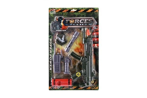 Reálně vypadající zbraň z plastu pro děti, samopal se zajisté bude líbit všem klukům, kteří mají rádi zbraně. Zbraň je se zvukem a světlem pro větší efekt v boji. Sada obsahuje také doplňky jako vysílačku, vojenský odznak, baterku, granát a také nesmí chybět dynamit. S touto sadou budete plnohodnotní členové armády!