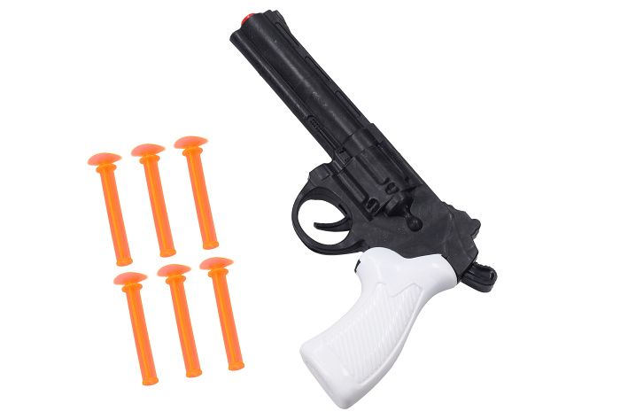 Pistole na přísavky pro malé bojovníky nebo pistolníky. Dětem se při hře s pistolkou a náboji nemůže nic stát, protože náboje jsou opatřeny přísavkami. Děti mohou střílet do terče, nebo i na sklo. Pistol je vyrobena z vysoce kvalitního a zdravotně nezávadného plastu, který je odolný vůči mechanickému poškození.