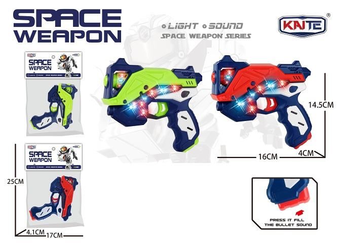 Pistole vesmírná s efekty. Velikost 16x4x14,5 cm. Vydává světelné a zvukové efekty. Zmáčknutím zásobníku na spodní straně zbraně se aktivuje zvukový efekt přebíjení. Baterie 2xAA nejsou součástí.